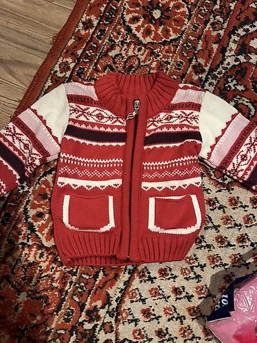 - Вязаная кофта/кардиган на молнии, красный с орнаментом. Два накладных кармана, высокий воротник-стойка, эластичные манжеты и низ.