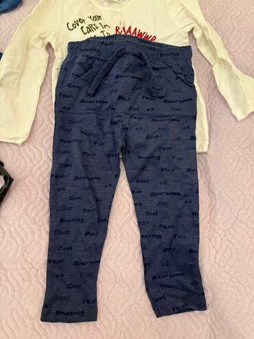 - Брюки джоггеры тёмно‑синие с набивным принтом слов (Cool, Fun, Play и др.), эластичный пояс на шнурке, боковые карманы.