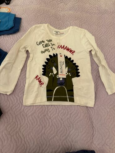 - Лонгслив молочного цвета с принтом динозавра и надписями “Cover your ears I’m going to RAAAWWR / RAWR”. Круглая горловина, на плече две кнопки для удобства переодевания.