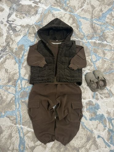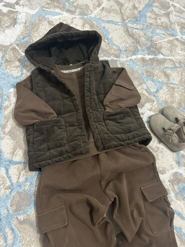 Детский комплект тройка , теплая. Новая. Размер: 90 Состав набора: - Утеплённый жилет без рукавов молочного цвета с капюшоном. Мягкий стёганый материал, застёжка на молнию и кнопки - Спортивный к...