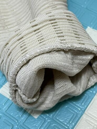 - Брюки/леггинсы бежевого цвета с мелким вязаным рисунком и манжетами по низу. На поясе декоративный золотистый бантик. Эластичная талия для комфортной посадки.