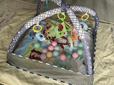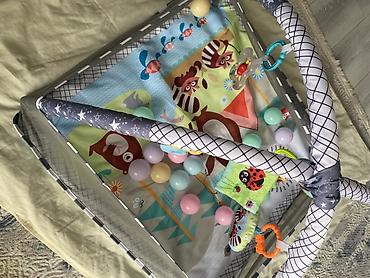 Комплектация на фото: коврик с мягким основанием, две пересекающиеся дуги, бортики-сетка по периметру, подвесные игрушки на кольцах, набор шариков.