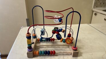 Представляем развивающую игрушку-лабиринт с бусинами, предназначенную для самых маленьких. Игрушка имеет прочное деревянное основание и несколько металлических стержней различных цветов: красный, синий и белый. По стержням перемещаются разноцветные деревянные бусины различной формы, включая фигурки животных, что способствует развитию мелкой моторики, логического мышления и координации движений у ребенка. В нижней части игрушки также расположен счетчик с бусинами на деревянных перекладинах, напоминающий счеты. Эта игрушка идеально подходит для стимулирования раннего развития и обучения в игровой форме.