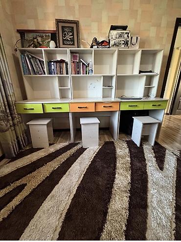 - Большой модульный рабочий центр на три места: длинная столешница, четыре выдвижных ящика по фронту (оранж и лайм), открытые стеллажи и ниши разной высоты и ширины для книг, тетрадей и декора. Три отдельные тумбы-пуфа/табурета под рабочие места.