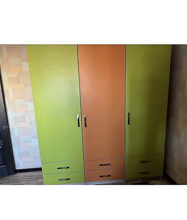 - Корпус ЛДСП светлого оттенка, фасады — яркие (лайм/оранж), металлические ручки.