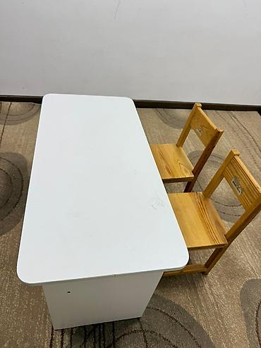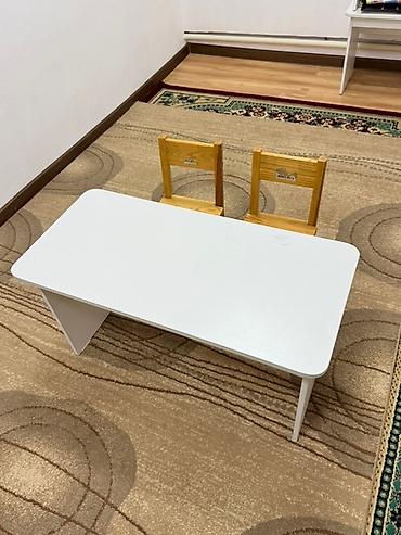 - Детский стол: белая столешница с закругленными углами, устойчивая опора. Высота комфортна для дошкольников.