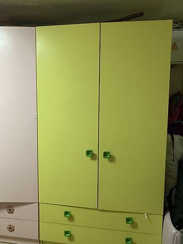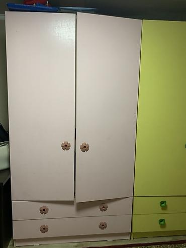 - Двухсекционный шкаф-купе модульного типа: левая секция розовая, правая — ярко‑зелёная. Каждая секция с распашными дверцами и выдвижными нижними ящиками. Удобные детские ручки (цветочки и зелёные квадраты). Внутри — отделения для вешалок и полки для одежды/игрушек.
