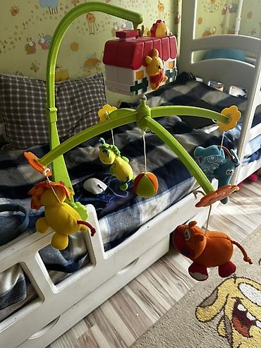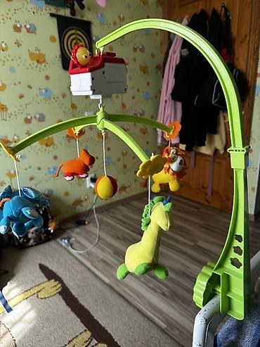 - Комплектация: дуга, прижимное крепление, карусель с 4 мягкими игрушками и мячиком, музыкальный блок-домик.