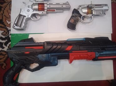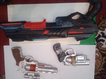 - Три игрушечных бластера/пистолета: два револьвера серебристого цвета и длинный футуристический бластер с красно‑чёрными элементами.