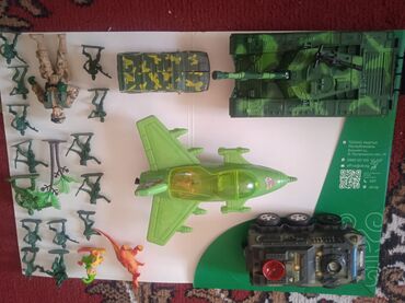 - Коллекция военной техники и солдатиков: танк, бронемашина, грузовик, реактивный самолёт, фигурки солдат, аксессуары.
