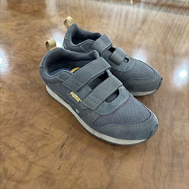 6) Кроссовки Puma, серые, на двух липучках, комбинированный верх (сетка + замша), петли для быстрого надевания сзади, золотистый логотип Puma сбоку.