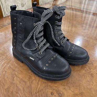 5) Ботинки черные, шнуровка контрастными черно-белыми шнурками, боковая молния, рифлёная подошва. Декор клёпками и вставкой с лёгким блеском; бирка на боковой части «PAILOSHI».
