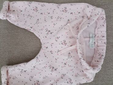 - Теплые брюки для малыша/малышки: нежно‑розовые, с мелким цветочным принтом, мягкий начес внутри, эластичный пояс со шнурком. На ярлыке указан размер 6–9 мес.