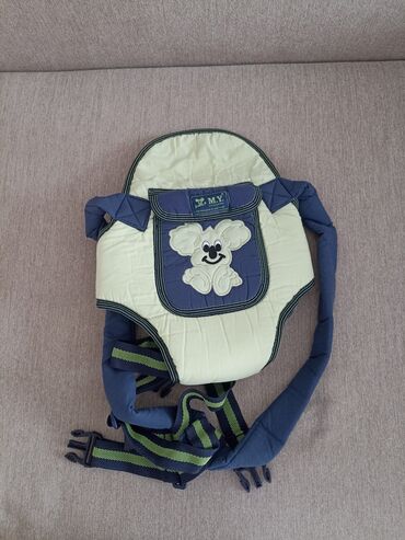 - Переноска‑кенгуру M.Y.: мягкая, двуцветная (кремовый/темно‑синий), с нашивкой‑мордашкой спереди; широкие ремни, регулируемые застежки, мягкие бортики.
