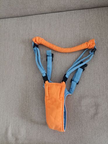 - Ходунки‑страховка для обучения ходьбе: текстильное изделие с мягкой верхней ручкой‑перемычкой (оранжевая), регулируемые плечевые ремни голубого цвета, фиксация на застежках‑фастексах.