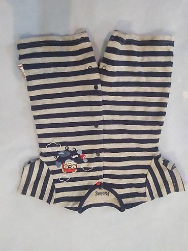 - Боди-песочник без рукавов в серо-тёмно-синию полоску на кнопках спереди. Украшен вышивкой с самолётиком и облаками; обработанные кантом горловина и проймы.