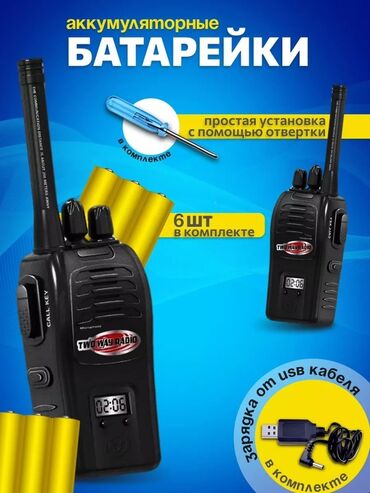 - В комплекте: 2 рации, 6 аккумуляторных батареек, USB-кабель для зарядки, отвертка, коробка.