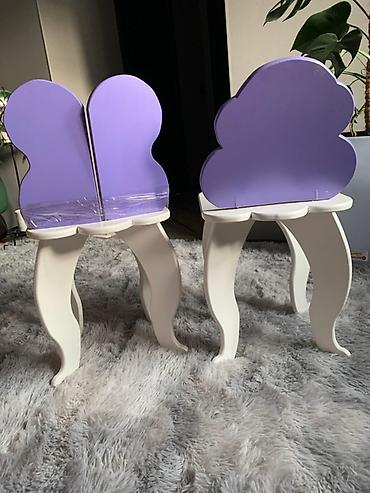 - Два стула: спинки фигурные (облако и бабочка), фиолетового цвета; сиденья и изогнутые ножки белые.