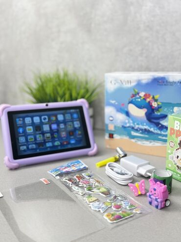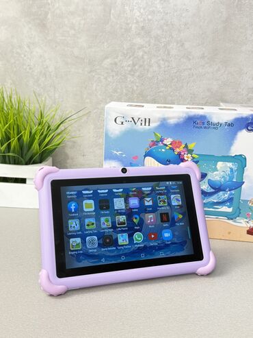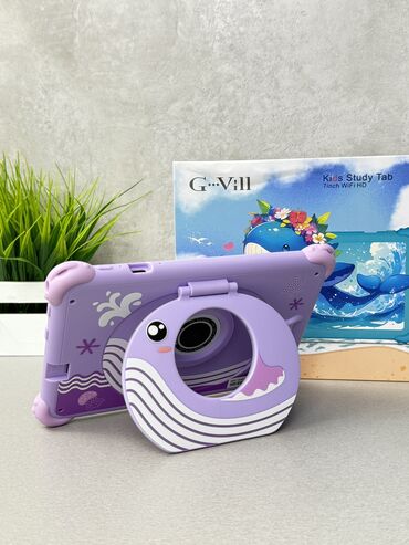 Детский планшет G-Vill G9A - Яркий коричневый чехол (фронтальная видна над экраном, задняя — на спинке). - Экран с диагональю около 7–8", под защитным бампером с утолщенными углами. - Съемный «об...