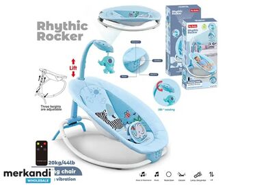 - На изображениях показаны варианты расцветок и комплектаций: яркая с животными, нейтральная с мягкими игрушками, голубая Rhythmic Rocker с вибрацией и музыкой.
