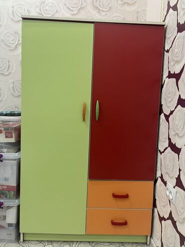 - Компоновка: левое высокое отделение с распашной дверцей (салатовая), правое отделение с распашной дверцей (бордо) и двумя выдвижными ящиками снизу (оранжевые).