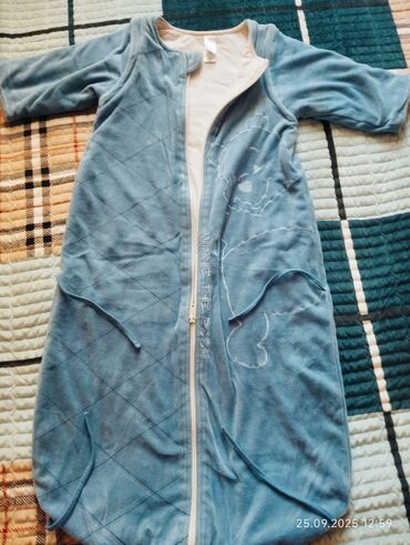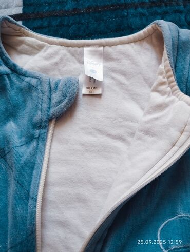 1) Голубой теплый спальный мешок Disney, размер на бирке: 98 cm (рост). Велюровая верхняя ткань, мягкая хлопковая подкладка. Длинные рукава. Центральная молния по всей длине для удобного переодевания, защитный ворот от касания молнии к шее. Стежка ромбами, вышивка с мишкой и вертикальная надпись “WINNIE THE POOH”. Анатомичная форма низа для свободы ножек.