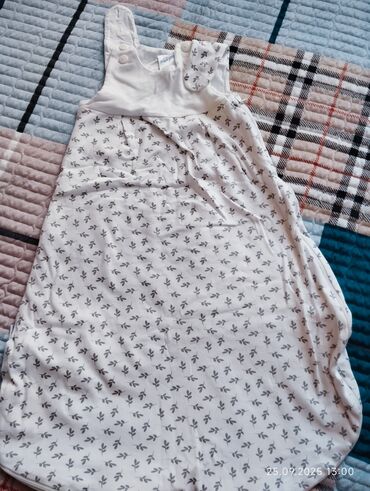 2) Белый легкий спальный мешок Beauty Baby, размер на бирке: 80 cm (рост). Приятный на ощупь трикотаж, принт с веточками. Застежки на плечах на пуговицах (две позиции регулировки). Свободный мешкообразный низ для комфорта во сне.