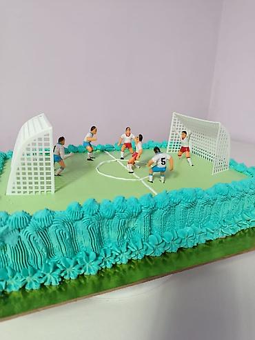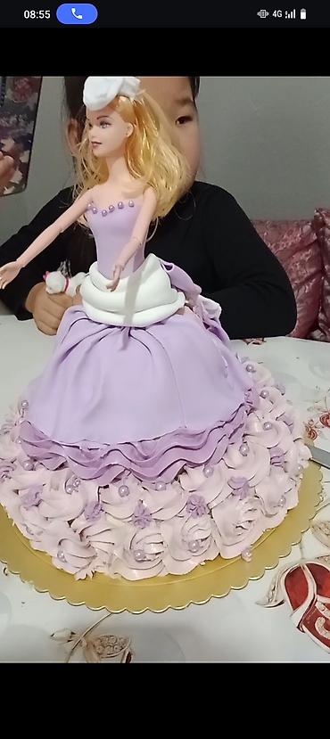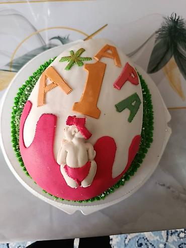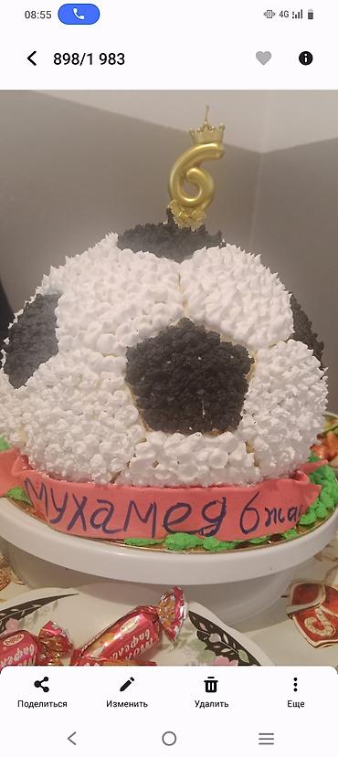 - Объёмные 3D-дизайны: мишка в кремовом “пушистом” оформлении; футбольный мяч с фигурной свечой и надписью; торт-кукла в сиреневом платье с розами; праздничный торт в виде яйца с мастичным декором и цифрой 1.
