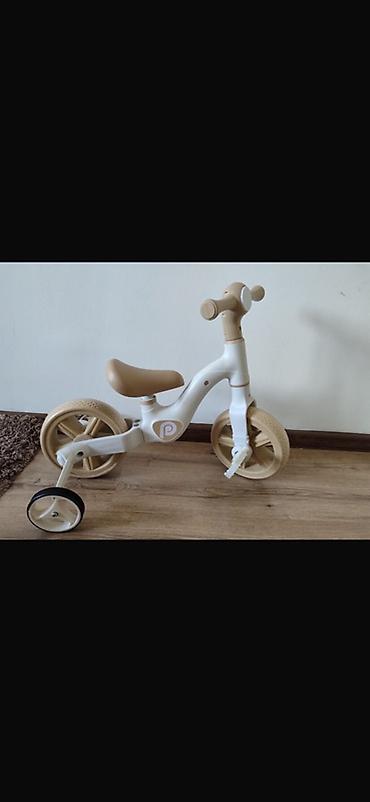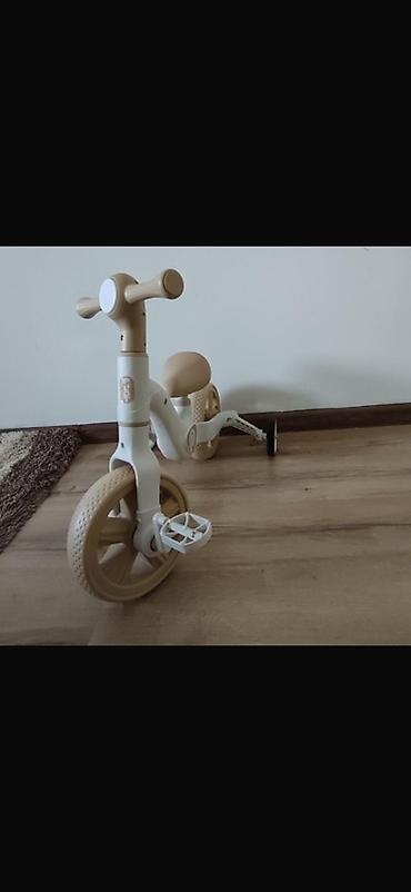 - Формат 3-в-1: беговел, трехколесный велосипед с дополнительным маленьким боковым колесом для устойчивости и двухколесный велосипед с педалями (педальный блок устанавливается на переднее колесо).
