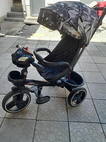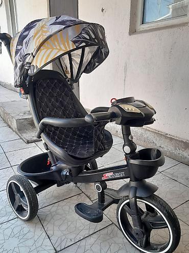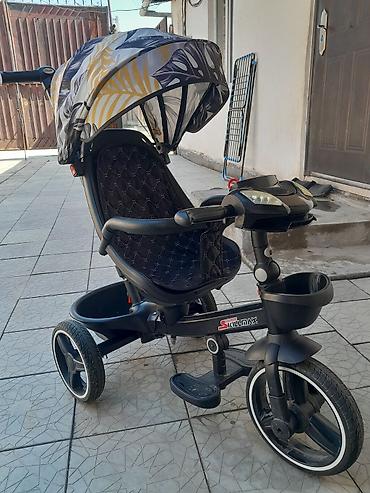 Подходит для прогулок с малышами, совмещает функции коляски и велика. Цвет: чёрный с белыми кантами колёс, капюшон серо-чёрный с жёлтыми акцентами. Бренд: Skillmax.