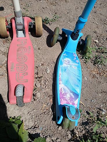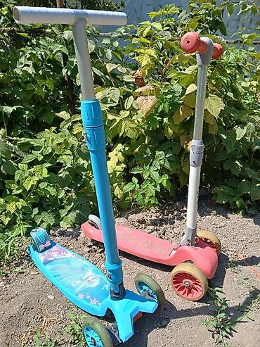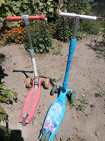 - Голубой с принтом «Frozen/Холодное сердце», широкая дека, два передних колеса и одно заднее, ножной тормоз на заднем крыле, регулируемая по высоте T-образная рулевая стойка с фиксаторами, полиуретановые колеса.