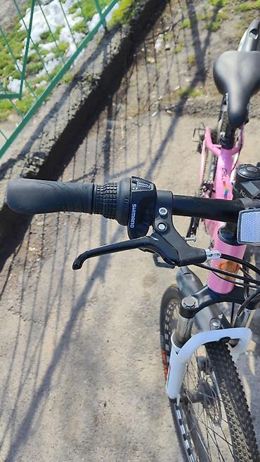 Розовый детский горный велосипед с передней амортизационной вилкой, обеспечивающей комфорт при езде по неровным поверхностям. Оснащен переключателем Shimano для плавного переключения скоростей и передним дисковым тормозом для надежного замедления. Имеются защитные крылья на переднем и заднем колесах, а также удобная подножка для парковки. Яркий дизайн делает его привлекательным выбором для юных велосипедистов.