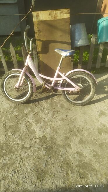 Детский велосипед с дополнительными боковыми колесами Особенности: - Размер колес около 16" (ориентировочно для роста ~105–120 см). - Рама с заниженной верхней трубой — удобно садиться и слезать. ...