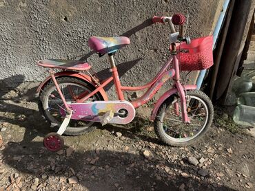Детский велосипед “Принцесса”, розовый, с дополнительными боковыми колесами для обучения.