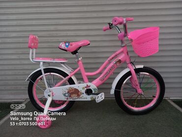 Детские велосипеды с дополнительными боковыми колесами - Размер колес: ориентировочно 16"–18" (подростковый/детский рост). - Варианты дизайна: - Розовые модели с тематическими принтами и пле...