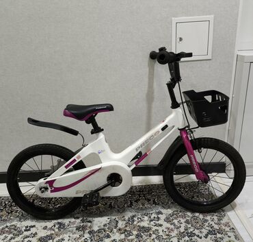 Цвет: белый с фиолетовыми/розовыми акцентами. Отлично подходит для роста примерно 105–125 см (ориентир для детей ~4–7 лет). Удобный и устойчивый велосипед для прогулок по городу и паркам.