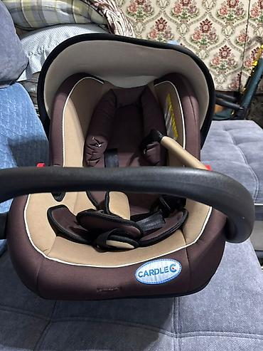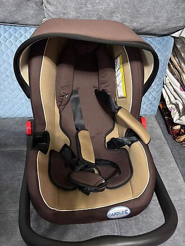 Автокресло Cardle C с удобной ручкой для переноски. Подходит для новорожденных и детей младшего возраста. Имеет мягкую обивку коричневого и бежевого цветов. Оснащено ремнями безопасности с регулировкой. Удобно использовать для транспортировки ребенка в автомобиле или переноски.