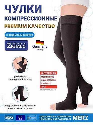 - Чулки компрессионные, премиум качества, 2 класс (22–32 мм рт. ст.), с открытым носком. Силиконовая резинка для фиксации на бедре, сверхпрочные эластичные нити в области стопы. Медицинский стандарт RAL-GZ 387, маркировка Gütezeichen. Germany Beauty. Изготовлено на новейшем немецком оборудовании MERZ. Пиктограммы соответствия ISO, ЕС и ВОЗ на упаковке.