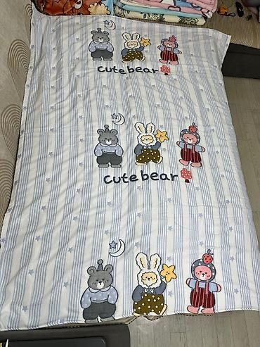 - Бело-голубое в тонкую полоску со звёздочками и надписями cute bear, персонажи мишка, зайчик и малыш с грибочком.