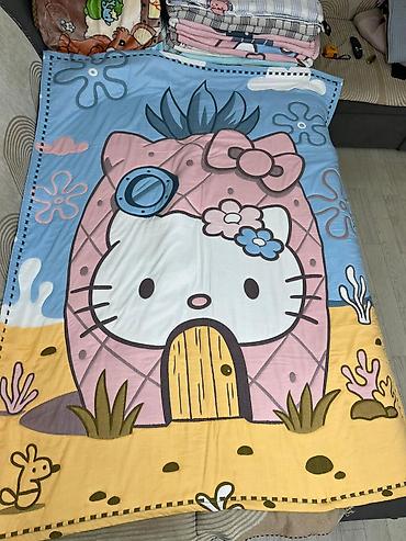 - Голубое покрывало с крупным мультяшным домиком-котиком в ананасе на песочном фоне.