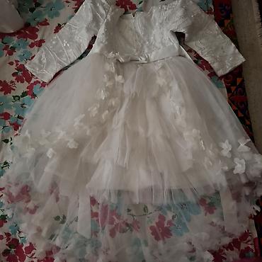 Нарядное детское платье цвета белого для торжеств. Очень красивое платье. Одевали один раз . Подойдет на 5-6 лет. Шлейф съел емный. - Силуэт: пышная юбка из многослойного фатина с каскадным низо...