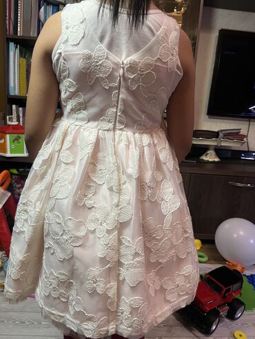 До 9 лет Нарядное детское платье в нежно‑розовом цвете. - Силуэт: расклёшенное, длина до колена. - Ткань: многослойная воздушная сетка с деликатным мерцанием; мягкая подкладка. - Верх: кружевн...