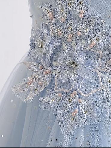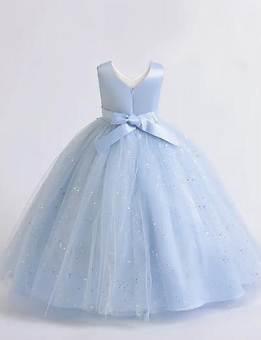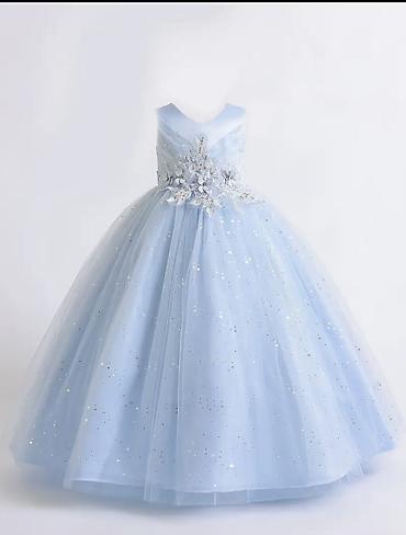 Нарядное детское платье в пол, светло-голубое/айс с белыми элементами на 7-10 лет. Производство Турция, покупали за 3000 сом, одевали один раз на выпускной. - Верх: полупрозрачная сетка по горлов...