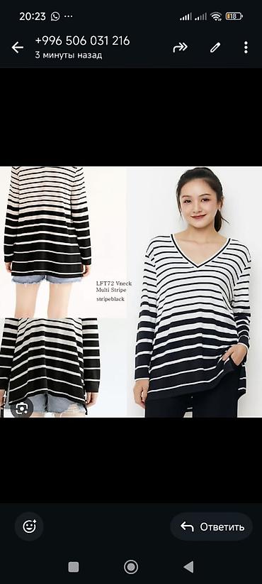 - Круглый вырез, бирка бренда на горловине. Подходит для повседневных образов и праздничных сочетаний с юбками и брюками.