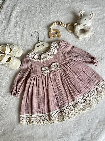 1 Пудрово‑розовое платье из мягкого муслина с длинным рукавом, снизу два слоя подкладка для пышности. Размеры: 68, 74, 80, 86, 92.
