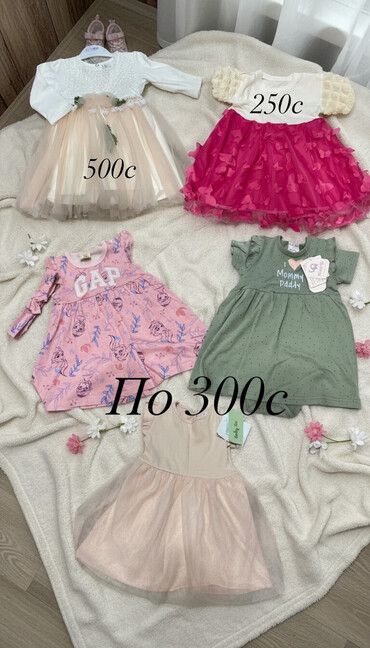 - Платья: розовое GAP с принтом, зелёное «Mommy Daddy», нежно‑розовое с фатиновой юбкой — по 300c
