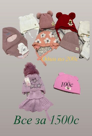 - Вязаные и трикотажные шапочки: с помпонами‑ушками, с цветочным узором, однотонные, балаклава — один по 200c