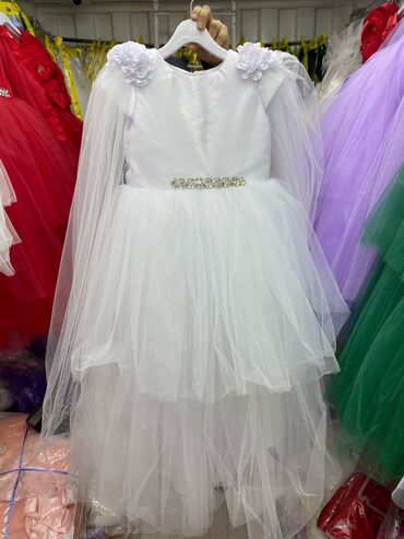 Нарядное детское платье белого цвета - Силуэт: пышная юбка в пол/миди с многослойным фатином, создающим объем и легкость. - Верх: атласный лиф с мягкими складками. - Рукава: длинные, полупрозрачны...