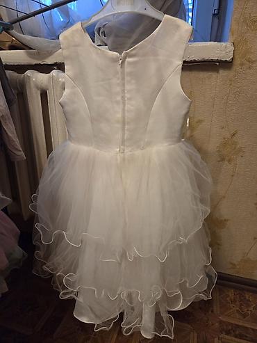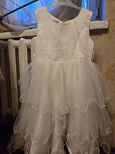 Нарядное детское платье цвета белого для торжеств. Очень красивое платье. Одевали один раз . Подойдет на 5-6 лет. Шлейф съел емный. - Силуэт: пышная юбка из многослойного фатина с каскадным низо...