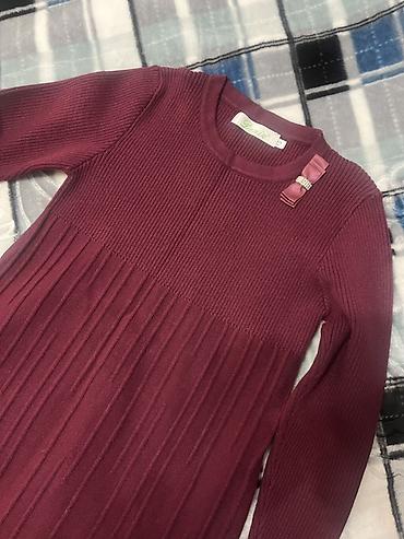 Состав и размер на ярлыке не указаны на фото; ориентируйтесь на детский рост, платье средней плотности, приятное на ощупь. Цвет — глубокий винный/марсала.